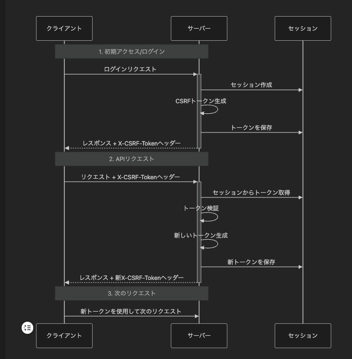 - クライアントが保持しているトークンをX-CSRF-Tokenヘッダーに付与してリクエスト