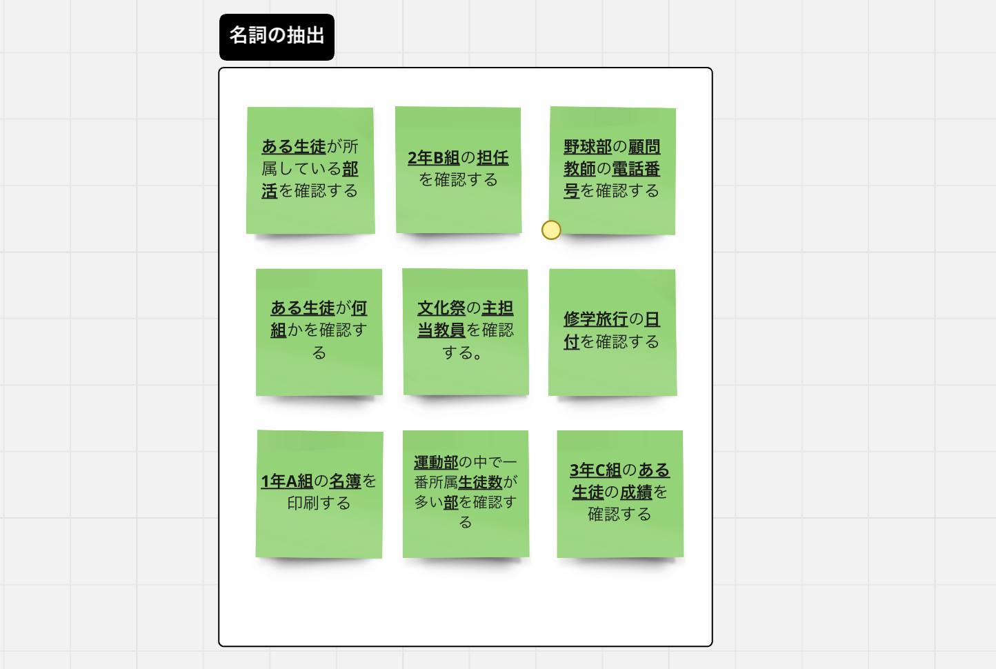 オブジェクトは名詞を手がかりに抽出します。 ユーザーの関心の対象となる概念は何かを考えて抽出すると考えやすいです。