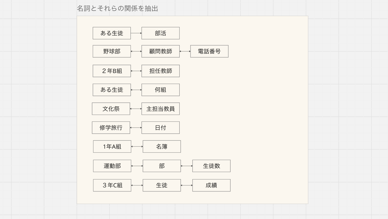 ここまで、タスクごとに名詞を抽出してきたので、ここからは名詞同士つなげて、アプリケーションを通じて扱われるオブジェクトを整理します。