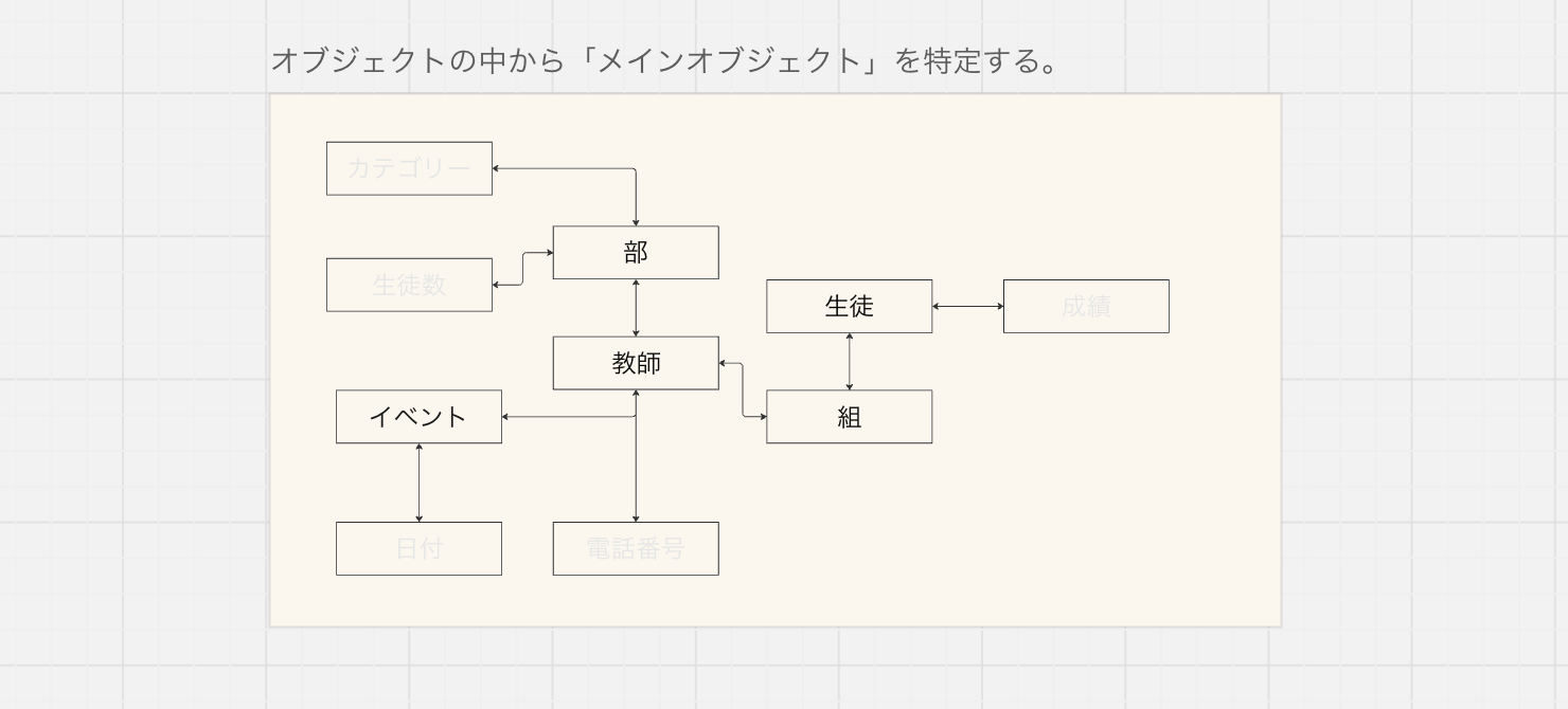 目的としては、何年何組に誰が所属しているか、所属している生徒の詳細(個人情報、所属部活)などを管理するためのものです。そのため、今回のタスクから抽出した中で、今回の場合、上記の黒文字で記載されているものが、メインオブジェクトとなります。