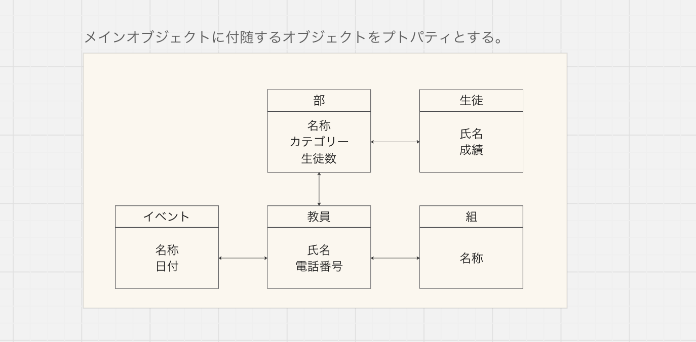 メインオブジェクトを構成するサブオブジェクトを「プロパティ」として取り扱い、上記のような関連性になります。